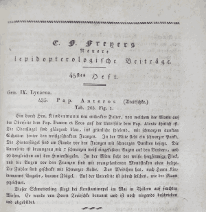 - Erstbeschreibung: Freyer, C. F. [1836-1839] („1839“): Neuere Beiträge zur Schmetterlingskunde mit Abbildungen nach der Natur 3: 1-168, pl. 193-288. Augsburg (beim Verfasser).