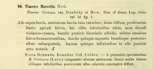 - Erstbeschreibung: Felder & Felder (1861): Lepidoptera nova Columbiae, Series secunda. — Wiener Entomologische Monatschrift 5 (4): 97-111.