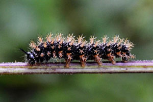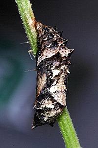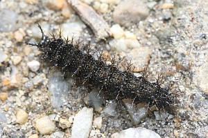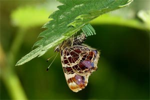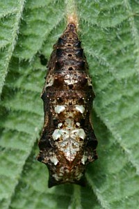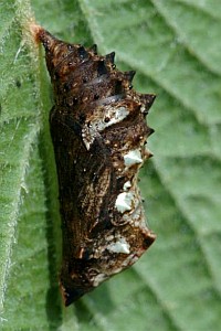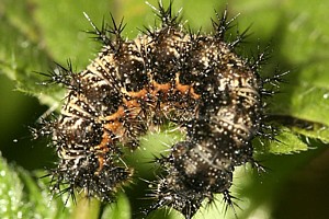 Schwarz gefärbte Raupen ähneln stark der von Aglais io. Sie tragen jedoch auf dem Kopf zwei Dornen und bauen im Gegensatz zur A. io-Raupe kein Nest.