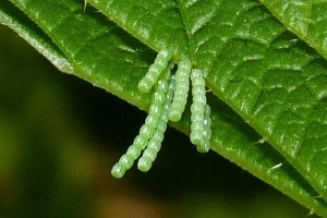 Das Weibchen legt die Eier stets in der Form kunstvoller, kleiner Türmchen an der Blattunterseite ab. Durch diese einmalige Form sind die Eier unverwechselbar.