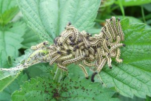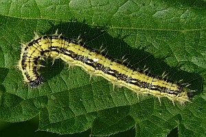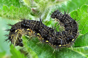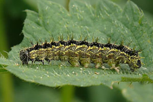 Das ♀ legt die Eier in Gelegen auf die Blattunterseite von jungen Brennnesseln (Urtica-spp.), fast immer der Großen Brennnessel (U. dioica). Sehr selten fressen die Raupen auch an Hopfen (Humulus lupulus). Die Raupen leben bis nach der letzten Häutung gesellig. Bei kühler Witterung legt die erwachsene Raupe eine Blatttüte, sehr ähnlich der der Raupe des Admirals (V. atalanta) an. Auch die Jungraupen können sich zuweilen gemeinsam in Blatttüten einspinnen.