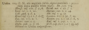 - Bezug einer Indikation in der Erstbeschreibung: Moufet, T. (1634): INSECTORVM SIVE Minimorum Animalium THEATRVM: Olim ab Edoardo Wottono. Conrado Gesnero. Thomaqve Pennio inchoatum: Tandem Tho. Movfeti Londinâtis sumptibusq; maximis concinnatum, auctum, perfectum: Et ad vivum expressis Iconibus suprà quingentis illustratum: [1]-[20], 1-326, pl. [1]-[4]. Londini (ex Officinâ typographicâ Thom. Cotes).