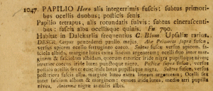 - Lectotypus-Festlegung: Honey, M. R. & M. J. Scoble (2001): Linnaeus's butterflies (Lepidoptera: Papilionoidea and Hesperioidea). — Zoological Journal of the Linnean Society 132: 277-399.