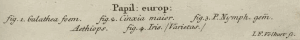 - Heppner, J. B. (1981): The dates of E. J. C. Esper's Die Schmetterlinge in Abbildungen ... 1776–[1830]. — Archives of Natural History 10 (2): 251–254.