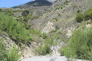 2: Schweiz, Wallis, Mazembroz, 2. Mai 2008, kleiner Wasserfall und ausgedehnte Kiesfläche (Foto: Heiner Ziegler)
