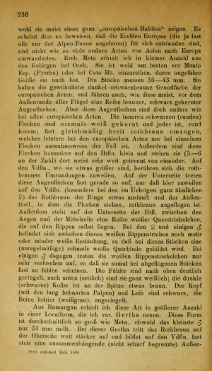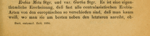 Staudinger, O. (1886: 238) erklärt: "Ereb. Meta erhielt ich in kleiner Anzahl aus den Gebirgen bei Osch", also aus dem Bergland südlich von Osch (Osh, Ош) in Kirgisistan. Ferner ist bei ihm zu erfahren: "Aus Namangan erhielt ich diese Art in größerer Anzahl in einer Localform, die ich var. Gertha nenne". Namangan liegt ganz im Osten von Usbekistan, rund hundert Kilometer entfernt von Osch.