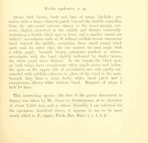 - Erstbeschreibung: Janson, O. E. (1877): Notes on Japanese Rhopalocera, with descriptions of new species. — Cistula entomologica 2 (16): 153-160.