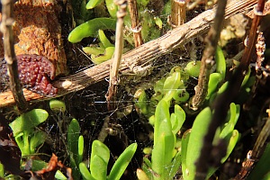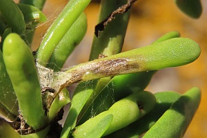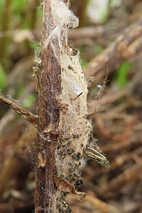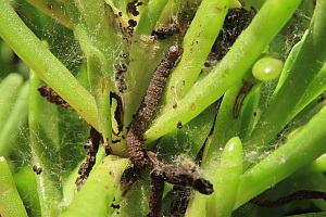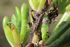 1-2: Fraß-Spuren bzw. Gespinste der Raupe an Salz-Alant (Limbarda crithmoides),, Frankreich, Manche, Les Pieux, 4 m, 13. April 2023, 13. April 2023 (det. & Fotos: Ruben Meert)