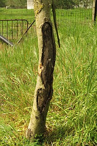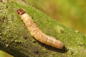 1-2: Belgien, Baasrode, Raupe im Rinden-Wundkallus einer junge Esche (Fraxinus excelsior) mit Stammverletzung, [1] im geöffenten Fraßgang, [2] zum Fotografieren auf Zweig gesetzt, 23. April 2019 (leg., det. durch Zucht & Foto: Ruben Meert)