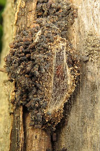 1: Belgien, Baasrode, mit Kot bedeckter Puppenkokon nahe Rinden-Wundkallus einer junge Esche (Fraxinus excelsior), nach Falterschlupf freigelegt, mit Exuvie, 12. Juni 2019 (det. & Foto: Ruben Meert)