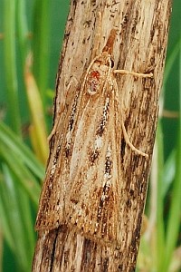 Schütze (1931) formulierte ganz ähnlich, sich dabei aber auf eine andere Quelle (und damit auch andere Region) berufend: "Kliewer fand die Raupen sehr zahlreich in Halmen von Scirpus lacuster, ihre Anwesenheit durch das lebhaft gelbe Aussehen der oberen Stängelhälfte verratend. Sie geht sehr tief nach unten, was man beim Herausschneiden der bewohnten Stiele berücksichtigen muss. Vor der Verwandlung fertigt sie ein ovales Bohrloch einige Zentimeter über dem Puppenlager (Sorhagen). Dass die Raupe auch in Phragmites vorkommt, ist unwahrscheinlich (Schütze)."