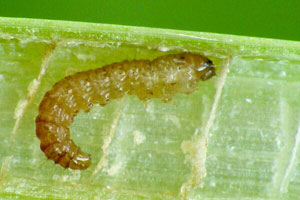 Die Raupe lebt von August bis Mai minierend in einem Blatt des Breitblättrigen Rohrkolbens (Typha latifolia), selten auch des Schmalblättrigen Rohrkolbens (Typha angustifolia) und angeblich auch in Schilf (Phragmites australis). Letzteres darf bezweifelt werden.