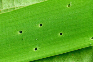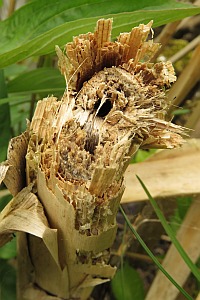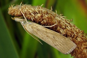 3-4: Belgien, Aalst, 11. Mai 2017, Breitblatt-Rohrkolben (Typha latifolia), [3]: mit mehreren Raupen besetzter, umgebrochener Stängel; [4]: mit feinem Gespinst verschlossenes zukünftiges Ausschlupfloch, (det. & Fotos Ruben Meert)
