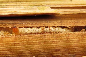 1-2: Belgien, Aalst, 11. Mai 2017, Raupe in totem Stängel von Breitblatt-Rohrkolben (Typha-latifolia) (leg., cult., det. & Fotos Ruben Meert)