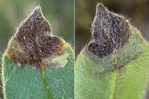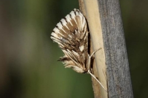 Auf den Vorderflügeln sind die Striche zwischen den dunklen Aderenden bei Cynaeda dentalis weisslich (im Bild: a) bei Cynaeda gigantea schwärzlich (im Bild: b). So nachzulesen bei Slamka, 2006: Pyraloidea of Europe, Vol. 1, p. 67. Das zweite Unterscheidungsmerkmal ist etwas weniger deutlich: Der letzte Zahn der Zackenlinie ist am Hinterrand der Vorderflügel bei Cynaeda dentalis weiter aussenrandwärts vorgezogen als beim Zahn darüber; bei Cynaeda gigantea ist er kürzer. (Text: Rudolf Bryner)