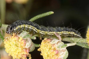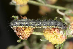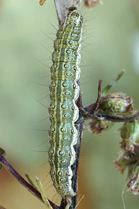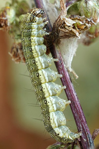 Schütze (1931: 191) erwähnt die Art nur vom Feld-Beifuß (Artemisia campestris). Diese Angabe findet sich zum ersten Mal bei Treitschke (1835: 11-12); dieser konnte auf eine Primärquelle mit exakter Beschreibung der Raupe und deren Verhalten und Entwicklung zurückgreifen und diese ausführlich zitieren: "Von Herrn P. Mussehl. "Die Raupe ist schlank, einen Zoll lang, und lebt von der Mitte August bis spät im September an Artemisia campestris, in einem trichterförmigen, zwischen den Blüthen angelegten Gespinnste, in welches sie sich bey der Berührung, nach Art mancher Wickler, mit rascher Bewegung rückwärts flüchtet. [...]""