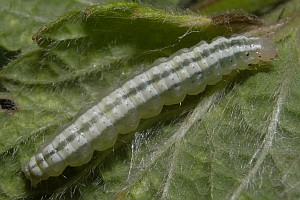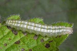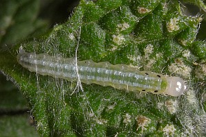 1: Befallsbild an Taubnessel (Lamium spec.), Raupe faltet Blatt nach unten: Deutschland, Sachsen, Doberschütz, Ruderalfläche am Waldrand, 19. August 2007 (Freilandfoto: Heidrun Melzer), det. Heidrun Melzer)Forum