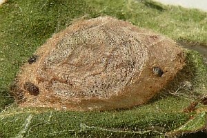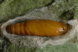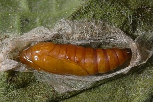 1: Verpuppungsgespinst mit Puppe, Deutschland, Thüringen, Umg. Jena-Göschwitz, Raupenfund am 11. Juni 2011 an Alant (Inula hirta) (leg., cult., det. & Foto am 1. Juli 2011: Heidrun Melzer)