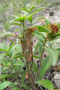 2: zusammen gesponnene und braun verfärbte Triebspitze von Inula hirta: Fundort wie Bild 1, 11. Juni 2011 (det. & Freilandfoto: Heidrun Melzer)