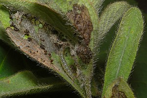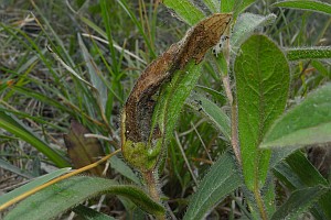 1: typisches Befallsbild an Alant (Inula hirta), auch nach Monaten noch sichtbar: Deutschland, Thüringen, Umg. Jena-Göschwitz, 19. Juni 2011 (det. & Freilandfoto: Heidrun Melzer)Forum