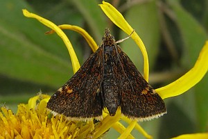 5-6: zwei ♂♂, Deutschland, Thüringen, Umg. Jena-Göschwitz, Raupenfund am 11. Juni 2011 an Alant (Inula hirta), e.l. 26. Juni bzw. 9. Juli 2011 (leg., cult., det. & Fotos: Heidrun Melzer)