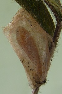 4: Verpuppungsgespinst, Deutschland, Baden-Württemberg, Kaiserstuhl, Oberbergen, Raupenfund an Dürrwurz-Alant (Inula conyza) 26. Juni 2010 (leg., cult. & Foto: Gabi Krumm), conf. Falter Rolf MörtterForum