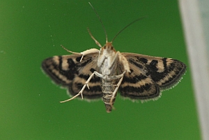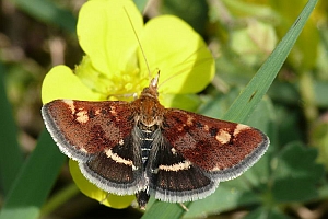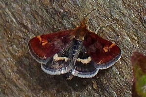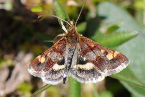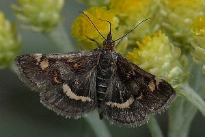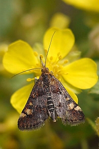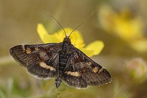 Pyrausta porphyralis fliegt in zwei Generationen. Die ersten Falter kann man oft Ende April/Anfang Mai an blühenden Salix-repens-Kätzchen sehen. Die zweite Generation ist weniger zu sehen. [Friedmar Graf]