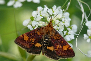Die Meldung zu Salvia glutinosa geht nach Heckford & Beavan (2021) auf die Zusammenstellung von Lhomme (1935: 145) zurück - hier möchte ich ein größeres Fragezeichen setzen, da Salvia glutinosa die mehrfach belegte Nahrungspflanze von Pyrausta falcatalis ist. Dass daraus in der Literatur schnell "Salvia spp." wurde, bedeutet nicht, dass es da irgendeinen (weiteren) Raupenfund gab. Ob Salbei-Arten wenigstens gelegentlich von P. aurata genutzt werden, ist erst noch zu belegen.