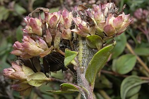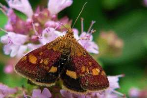 Auch bezüglich der Nennungen von Thymus besteht eine grundsätzliche Unsicherheit wegen der Verwechslungsmöglichkeit mit Pyrausta ostrinalis. Nach Heckford & Beavan (2021) akzeptiert Buszko (2020: 38-40) neben Dost und Minzen-Arten auch Thymus pulegioides als Nahrungspflanze von P. aurata. Falls das stimmt, spielt der Feld-Thymian sicher nur eine unbedeutende Rolle als Raupennahrungspflanze der Art.