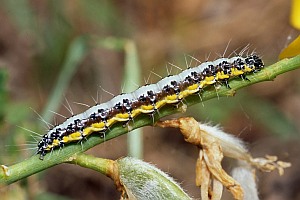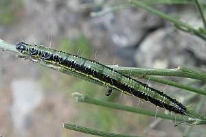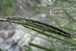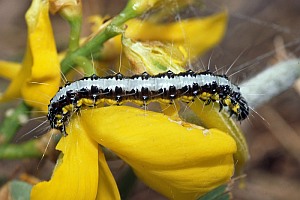 Felix Riegel [Forumsbeitrag 9. November 2018] fand Raupen der Art auf Gran Canaria an Teline microphylla, einem Gran Canaria-Endemiten. Ebenfalls von den Kanarischen Inseln stammen Angaben zu "Retama raetam" von Klaus Nowak [Forumsbeitrag 24. November 2010] und Markus Welz [Forumsbeitrag 31. März 2012] (siehe auch Bilder oben); wie sich mittlerweile zeigte, handelt es sich auf den Kanarischen Inseln aber nicht um diesen in Nordafrika weit verbreiteten Rutenstrauch, sondern um eine nahe verwandten Kanaren-Endemiten: Retama rhodorhizoides. Den Pfriemenginster (Spartium junceum) können wir durch Raupenfotos von Helmut Deutsch aus Österreich bestätigen (s.o.).