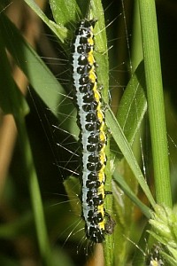 Die Raupe lebt an verschiedenen Ginster-Arten, in Mitteleuropa zumeist am Färber-Ginster. Schon Rößler ([1867]: 401) meldete dazu in seinem Nachtrag: "Die Raupe bei Lorch im Juli gesellig auf Genista tinctoria." Schütze (1931) trug zusammen: "An Genista, Ulex, Sarothamnus, Cytisus (Sorhagen). An Genista tinctoria unter wenig Gespinstfäden Blüten und Blätter verzehrend, so dass die Triebe kahl aussehen (Schmid)."