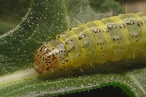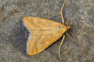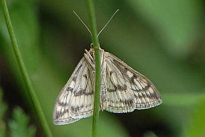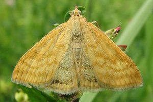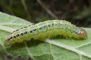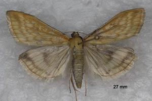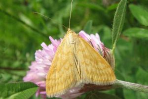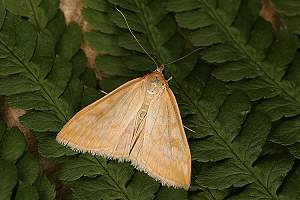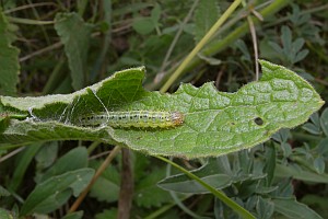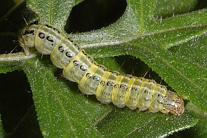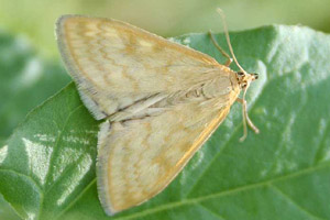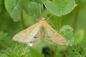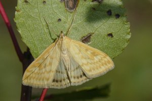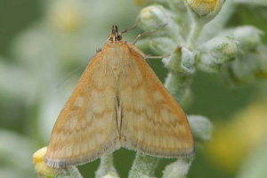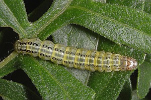 Schütze (1931: 164) berichtet zur Raupe: "An Teucrium scorodonia, Sarothamnus [Cytisus scoparius], Cirsium arvense (Nolcken), Atriplex und so weiter (Spuler). Verwandlung in festem, dick mit Sandkörnern bedeckten Kokon (Sorhagen)." Er zeichnet also das Bild einer sehr polyphagen Raupe, die Pflanzen ganz unterschiedlicher Familien nutzt. Unsere Mitarbeiter meldeten die Art bisher nur von Asteraceae. In der sonstigen Literatur werden noch weitere Pflanzen gelistet, aber hier setze ich Fragezeichen, solange ich die Primärquellen noch nicht studiert habe. Insbesondere bei der häufig genannten Großen Brennnessel (Urtica dioica) spricht alles für Verwechslung mit Patania ruralis - ein Fehler, der auf Linné (1758: 533) zurückgehen könnte, denn der schreibt: "Habitat in Urtica Tortrix".
