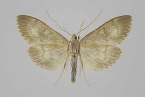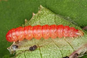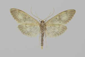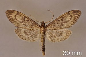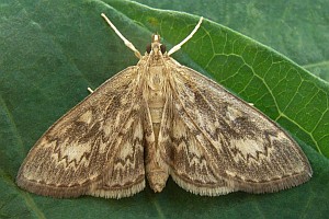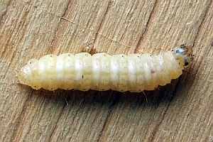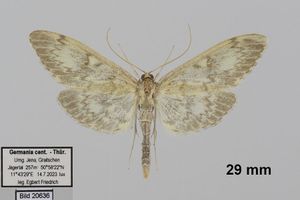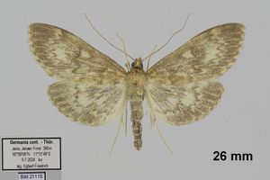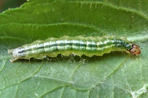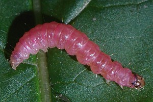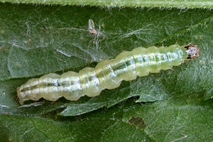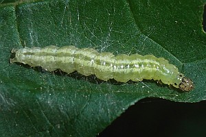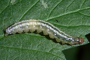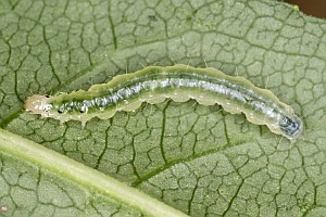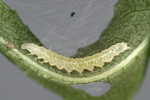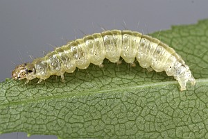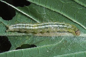 von Heyden (1862: 172-173) konnte entsprechend melden: "Raupe etwas spindelförmig, dick, glatt, mit einzelnen kleinen, ein helles Härchen tragenden Wärzchen besetzt, grünlich weiss mit 3 dunkler grünen Längsstreifen, wovon die an den Seiten am breitesten sind. Kopf herzförmig, glatt, glänzend, gelblich, braun marmorirt, am Hinterrand braun,vor den braunen Fressspitzen ein brauner Punkt. Nackenschild mit dem Körper gleichfarbig, beiderseits drei kleine braune Pünktchen. Afterklappe grün marmorirt. Beine grünlichweiss. Die Raupe lebt bei Frankfurt Mitte October auf Eupatorium cannabinum zwischen röhrenartig zusammen gesponnenen Blättern. Sie überwintert in einem grossen, dünnen, ovalen, flachen, weissen Gespinnste, verpuppt sich im April. Ende Mai erscheint der Zünsler. (Die von Kaltenbach angegebene Farbe der Raupe stimmt nicht mit der hier beschriebenen.) (1829)."