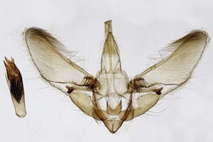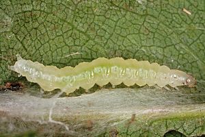 Schütze (1931) stellt zusammen: "An feuchten Waldstellen an Senecio fuchsii, Senecio sarracenicus, Senecio nemorensis, Eupatorium, Stachys silvatica, Sium latifolium in einem röhrenförmig zusammen gezogenen Blatt, verwandelt sich im Frühjahr in einem Gespinst an der Erde, frisst sich auch in dürre Himbeerstängel ein (Sorhagen und andere)." Nicht berücksichtigt hatte er dabei anscheinend die Arbeit von Disqué (1901) über "in der Umgegend von Speyer vorkommende Kleinschmetterlinge", in der dieser schreibt: "an Teucr. scor., Stachys pal. und Eupatorium cann. häufig." Und auch der noch ältere Hinweis von EPPELSHEIM (1890: 53) ebenfalls aus der Pfalz fand keinen Eingang: "Raupe Ende August, Anfang September an der Unterseite der abwärts gebogenen Blätter von Teucr. Scorodonia in leichtem Gespinnste".