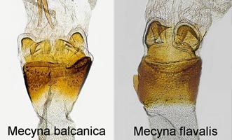 Nach Slamka & Plant (2016) hat M. balcanica deutlichere und stärker kontrastierende Zeichnungselemente auf den Unterseiten der Flügel als bei Mecyna lutealis; eine sichere Unterscheidung gegenüber Mecyna flavalis ist nur durch Genitaluntersuchung möglich.
