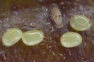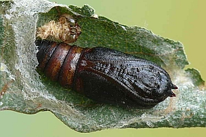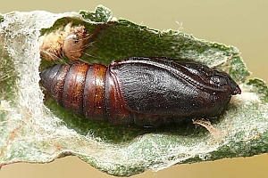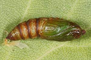 2-4: Puppe und ihre Blattrolle, Daten s. Raupenbilder 4-5 (Studiofotos am 24. Juni 2007: Jürgen Rodeland), cult. & det. (Falterschlupf am 5. Juli 2007) Jürgen Rodeland [Anm. zu Bild 1-3 im Forum]