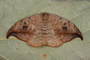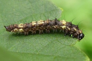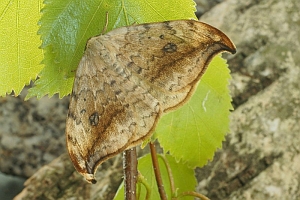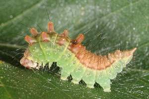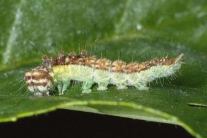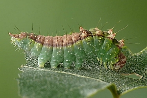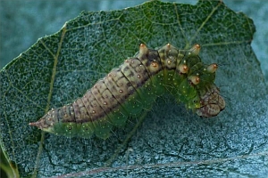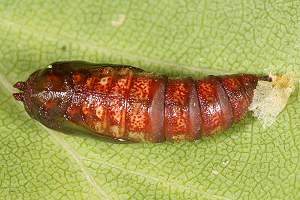 Unterscheidungsmerkmale der Raupen von Drepana falcataria und Drepana curvatula: Die seitliche Begrenzung des Sattelflecks ist bei D. falcataria scharf und dunkel begrenzt, bei D. curvatula ist sie verschwommen. [Stefan Ratering].