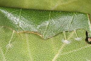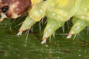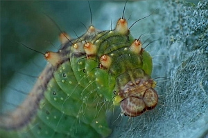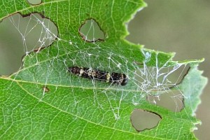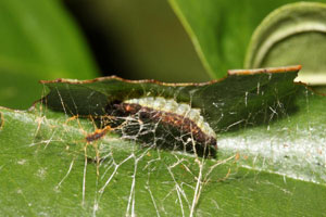 Die Raupe fertigt am Blatt ein Gespinst an.