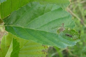 1-2: L3 beim Gespinstbau, Deutschland, Niedersachsen, Ortsrand Rodenberg, Regenrückhaltebecken im Neubaugebiet, 50 m, an Schwarz-Erle (Alnus glutinosa), 24. August 2014 (Freilandfotos: Tina Schulz) [weitere Bilder im Forum]