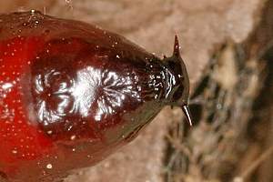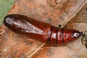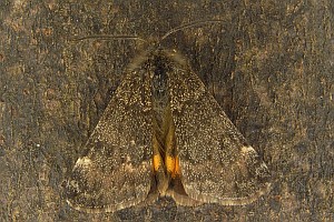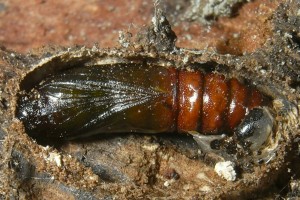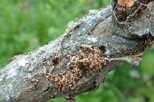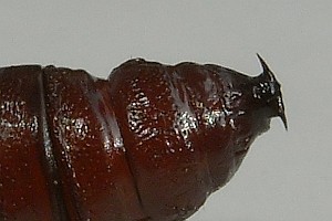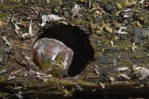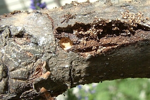 Die B.-notha-Raupe nagt sich zur Verpuppung ein eigenes Loch in morsches Holz. In Bild 1 und 2 sieht man zwei solcher Verpuppungsröhren, die mit einem kleinen Deckel aus Genagsel verschlossen sind. Das ausgestoßene Bohrmehl ist ebenfalls gut zu sehen. Im Bild 2 kann man bei einer anderen Puppenwiege den kleinen Holzspanverschluss ganz gut sehen. Text: [Stefan Ratering]