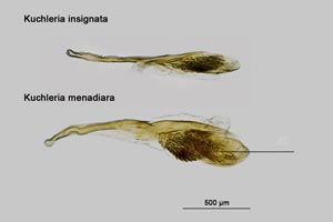 Die Unterscheidung von Kuchleria menadiara von der Schwesterart Kuchleria insignata erfolgt am besten über den Aedeagus. Dieser besitzt bei K. menadiara ein zweites distales Feld mit Cornuti, das bei K. indigata fehlt [Harald Lahm in Forum].