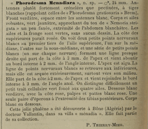 Thierry-Mieg (1893) teilt mit: “Cette jolie phalène a été découverte à Bône (Algérie) par le docteur Vallantin, dans sa villa « ménadia ».”
