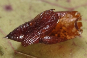 1-5: (4-5: Exuvie & Kremaster), Deutschland, Rheinland-Pfalz, Kreis Cochem-Zell, Klotten, Naturschutzgebiet Dortebachtal, Aussichtspunkt "Kasteschkopp", ca. 210 m, Raupen am 13. Juni 2014 von Besenginster (Cytisus scoparius) geklopft, 14. Juli 2014 (cult., det. & fot.: Tina Schulz)Forum