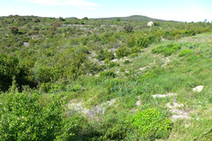 1: Gesamtansicht des Gebietes. Im Vordergrund bewirtschaftete Bereiche (Felder), anschließend Terassen (aufgelassen, aber wohl noch beweidet) und auf der Kuppe des Hügels lichter Wald mit viel Quercus sp., Ulmus und verschiedenen Zwergsträuchern und Kräutern im Unterwuchs: Frankreich, Provence, Département Alpes-de-Haute-Provence, nordöstlich Oraison, Hauts Bronzets, 590 m, 26. September 2015 (fot.: Egbert Friedrich)