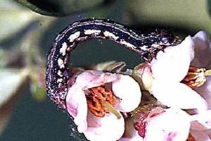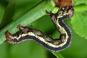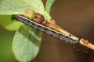 3: vorvorletztes Stadium, Deutschland, Sachsen, Doberschütz, an Heidelbeere (Vaccinium myrtillus), 4. Mai 2008 (manipuliertes Freilandfoto: Heidrun Melzer), leg., cult. & det. Heidrun Melzer