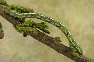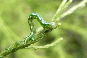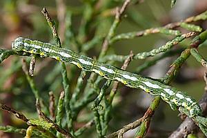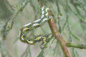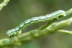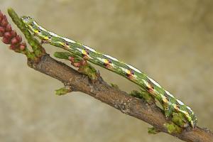 Sollte die als Raupe an Tamarisken (Tamarix spp.) lebende Art in Deutschland weiter in Ausbreitung begriffen sein? [Raupenfoto siehe Gómez de Aizpúrua (2001)] [GÓMEZ DE AIZPÚRUA (2001)]. Dann ist sie dabei ganz auf Gärten angewiesen, denn wildwachsende Tamarisken der Gattung Tamarix gibt es in Deutschland nicht, und die "Deutsche Tamariske" (Myricaria germanica) ist räumlich weit von den südwesteuropäischen Vorkommen des Falters getrennt. Bläsius (2008) kommt hier zum Schluss: „Verschiedene Arten der Gattung Tamarix werden entlang der Autobahnen, in Hausgärten oder Parkanlagen in genügender Stückzahl angepflanzt, so dass diese Orte als Trittsteine für eine weitere Ausbreitung dienen können.“ Ein Vorkommen in der Pfalz war schon nach dem ersten Nachweis in Baden-Württemberg und dem Fund etlicher Falter und Raupen 2003 in Lothringen 5 km von der Pfalz entfernt zu vermuten, mittlerweile ist die Art in Teilen der Pfalz und auch in der badischen Oberrheinebene stabil vorhanden (z. B. [Forumsbeitrag D. Kremb 31. August 2012], [Forumsbeitrag J. Bastian, 20. Oktober 2012], [Forumsbeitrag D. Kremb, 12. Juni 2013], [Forumsbeitrag F. Ramin, 12. Juni 2013], [Forumsbeitrag D. Fritsch, 26. Juni 2013], [Forumsbeitrag M. Hund, 27. September 2015]). Die weitere Ausbreitung dürfte nach Bläsius (2008) Richtung Luxemburg, Rheinland und Südhessen erfolgen.