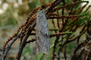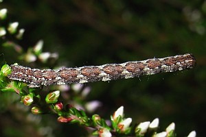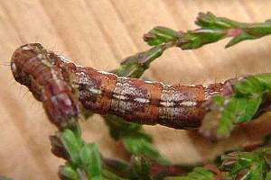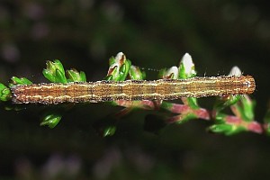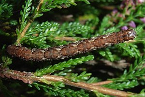 2-3: Deutschland, Baden-Württemberg, Oberrheinebene, Baden-Airport bei Rheinmünster-Stollhofen, 27. Juli 2007, Raupe an Heidekraut (Calluna vulgaris), Raupe leg. 27. Juli 2007, e.l. 11. Februar 2008, 12. Februar 2008 (Studiofotos: Heidrun Melzer), leg., cult. & det. Heidrun Melzer