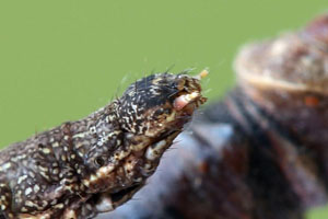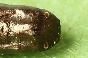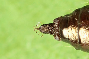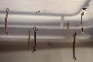 4: Jungraupen (in Zucht) ruhten meist am Seidenfaden - und häuteten sich auch dort: Deutschland, Niedersachsen, Region Hannover, Sehnde, 70 m, Bahnhof, 14. Juni 2018, ♀ tags am Licht sitzend, anschließende Eiablage, Zuchtfoto 27. Juni 2018 (cult., det. & fot.: Tina Schulz)Forum