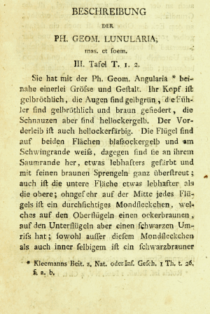 - Erstbeschreibung: Hübner, J. (1788): Beiträge zur Geschichte der Schmetterlinge. Erster Band. Dritter Theil: 1-36, pl. I-IV. Augsburg (beim Verfasser). Digitalisat der Universitätsbibliothek Heidelberg: [27], [pl. III].