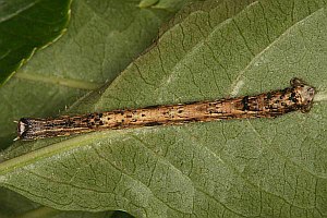 1: Deutschland, Thüringen, Umgebung von Jena-Göschwitz, Raupenfund am 18. April 2008 an Lonicera (Foto am 19. Mai 2008: Heidrun Melzer), leg., cult. & det. Heidrun Melzer